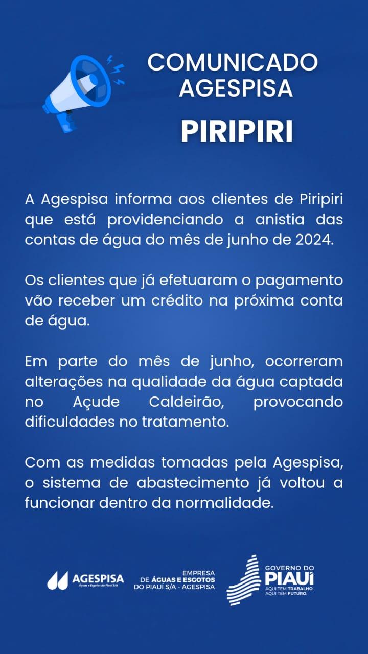 A Agespisa anunciou a anistia das contas de água referentes ao mês de junho de 2024 para a cidade de Piripiri, situada a 166 quilômetros de Teresina. A decisão foi formalizada por meio de uma resolução da diretoria e abrange 16.312 imóveis.